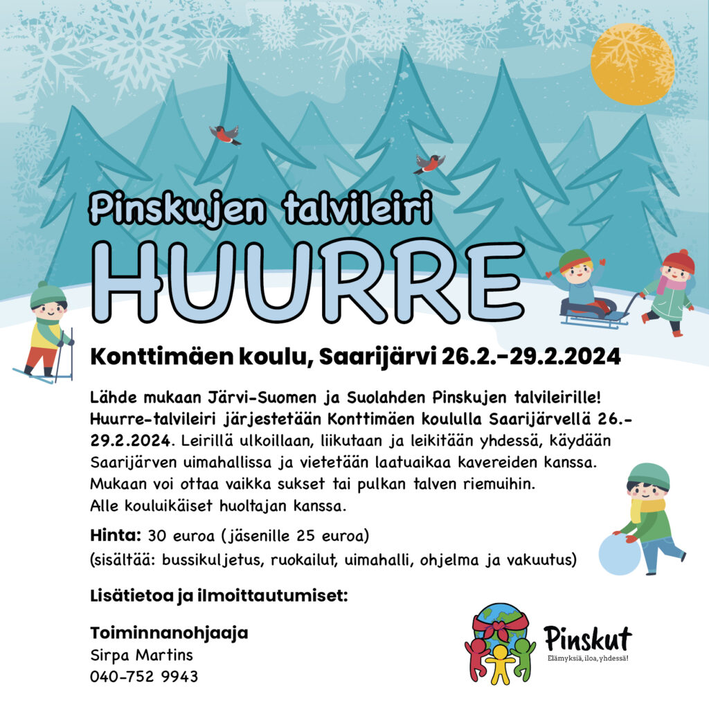 Huurre-talvileiri järjestetään Konttimäen koululla Saarijärvellä 26.-29.2.2024. Leirillä ulkoillaan, liikutaan ja leikitään yhdessä, käydään Saarijärven uimahallissa ja vietetään laatuaikaa kavereiden kanssa. Mukaan voi ottaa vaikka sukset tai pulkan talven riemuihin. Alle kouluikäiset huoltajan kanssa.